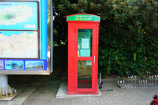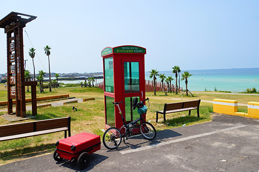 このビーチの駐車場に佇む赤い電話ボックスが済州幻想自転車道の最後のチェックポイントだ。