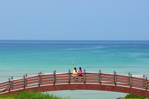 小さな入江に守られたハンドクビーチは波も穏やかで済州島のビーチでは一番好みだった。浅瀬が遠くまで続いているおかげで、エメラルドブルーの水面が一際目立つ。透明度はもちろん抜群で、海の中をちょこまかと泳ぐ魚影も容易く捉えることができる。