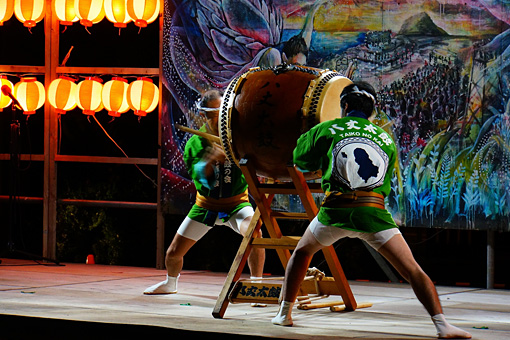 八丈太鼓の特徴は、片面の打ち手が一定のベースリズムを作り、もう一方の打ち手がアドリブを入れる両面太鼓だ。この日の打ち手は親子だそうで、息の合った拍子が実に心地よく響く。流れるようでいて、緩急をつけた動きのバチさばきは見ていて惚れ惚れしてしまう。