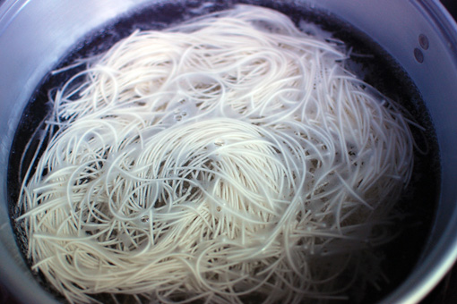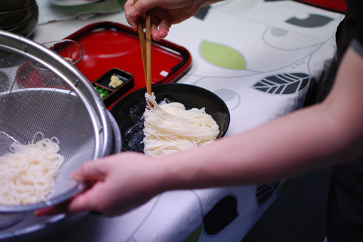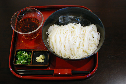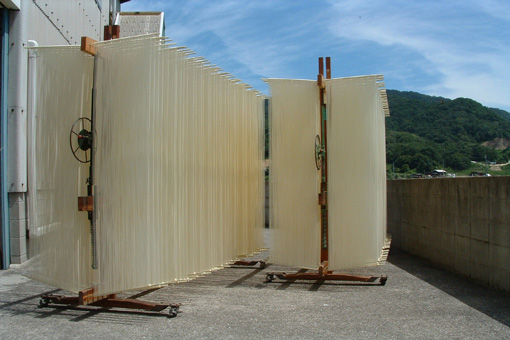 「そうめんは、伸ばして外に干してからも、太陽の動きや風の動きなどを常に見ていないといけない。だから、伸ばしたばかりのできたてを、生だろうがなんだろうがその場ではさみで切ってさっと茹で、立って食べる。それが、職人たちのまかないなのです」。そしてそれは、義景さんが子どもの頃、忙しくもいきいきと働く父親の横で食べたそうめんの味でもありました。