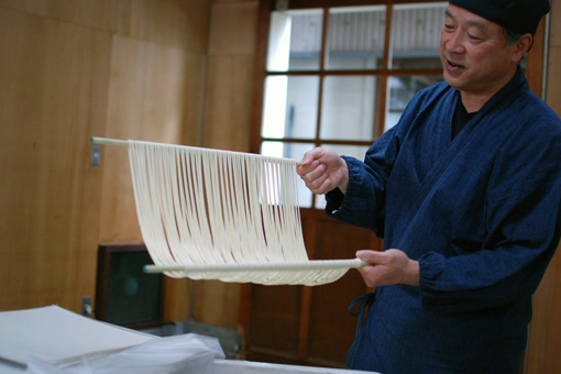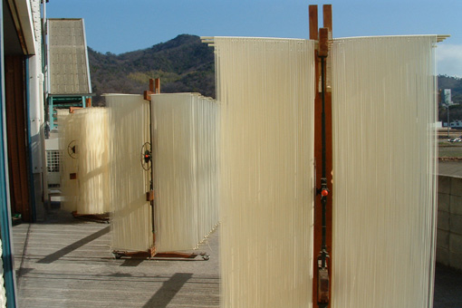 夏の食べ物のイメージが強いのですが、そもそも農閑期の農家の副業として広まったそうめん作りなので、ピークはもっぱら10月から3月。「伸ばした麺は外に干して乾かすので、低い湿度や晴れが多い小豆島の冬はとても条件がよかったんです」。そう話すのは、『なかぶ庵』のご主人・中武義景さん。「光と風がまんべんなく当たることで、色白のきれいなおそうめんができるんですよ」。だからこそ晴れの日にだけ仕込むのだと、優しい笑顔を浮かべて話します。