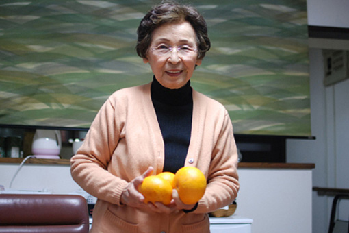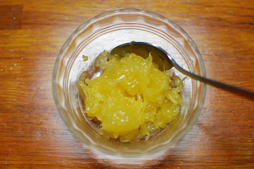 「私は畑仕事がどうも苦手なようで、何をやってもうまく育てられなくて 。でも、庭にある1本のはっさくの木だけは、毎年よく実ってくれるんですよ」。毎年実るはっさくは、しかしそのまま食べるには少し苦く、同じくはっさくがたくさん実るご近所さんたちもいつも持て余していたのだと言います。なんとかおいしく食べられないかとご近所さんからも相談を受け、デザートを考案。はっさくの果実の部分を取り出し、重曹をふりかけ少し苦みを取る。毎年漬けている自家製の梅酒と、少量の砂糖を加えて半日置いておくのだそう。「ご近所さんにもお裾分けすると、みなさん気に入って下さってね、この食べ方が一番おいしいと言って下さるの」と嬉しそうに、ちょっぴり誇らしげに話してくれます。