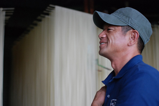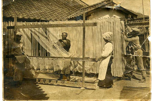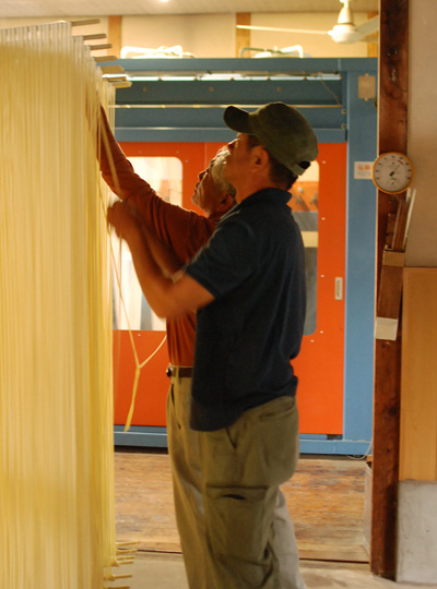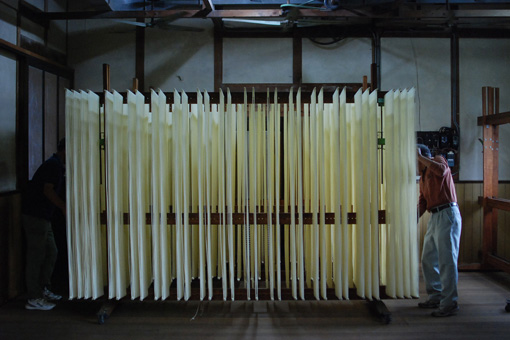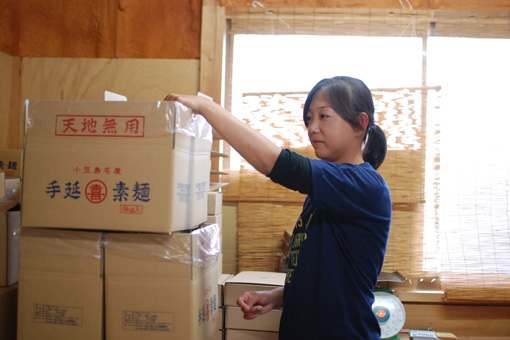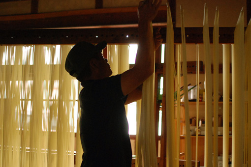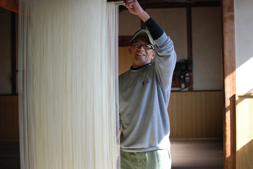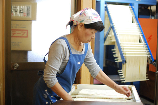 真砂家に代々伝わるそうめんづくりに現在携わるのは、3代目博明さんと4代目淳さん、そしてそれぞれの奥さんの4名。家族みんなでそうめんづくりに携わる姿は、どうやら今も昔も変わらぬよう。そうめんを干している最中にみんなで食べるお昼ご飯は、必ずそうめん。「色んな食べ方があるようですけど、私たちはやっぱりそのままおつゆで頂くのが一番ね」と、お母さんがにっこり。