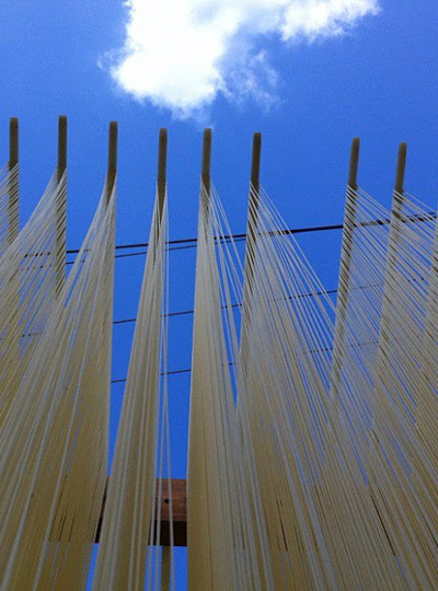 夏に食べることが多く、「夏の風物詩」なイメージが強いおそうめんですが、実は生産するのはほとんど冬。カラッとした空気の中で、太陽をたっぷり浴びてできる小豆島の手延べそうめんは、小豆島の「冬の風物詩」です。レトロでかわいらしい建物に入ると、ふわっと香るごま油の香り。ごま油の産地としても有名な小豆島だからこそ、そうめんを伸ばす際に贅沢にもごま油を使用します。今回お邪魔したのは、そうめんの生産地である小豆島のなかでも、約100年と長い歴史を持つ『真砂喜之助製麺所』。