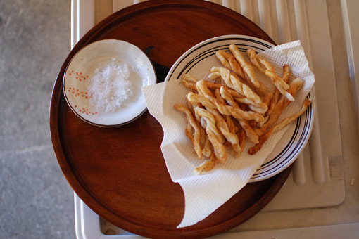 「こよりっていうのがあってね」。そう言いながら、淳さんは伸ばす前の行程のそうめんを持って来てくれました。それをねじって油で揚げ、お好みで砂糖をふって頂くというスナックができあがり。サクッとした外側に内側はもちっ。パンともまた違う食感で、おそうめんに含まれた塩味がなんとも言えずおいしい。「これは、塩分が少ない寒い時期、12月~2月がベストやね」と笑顔で話す淳さん。