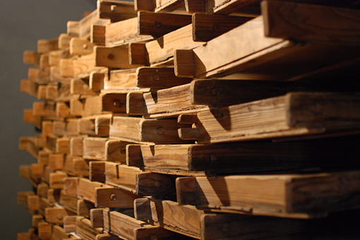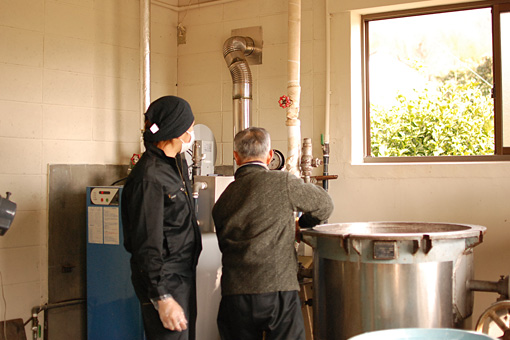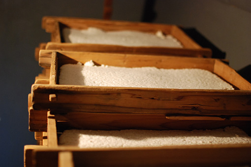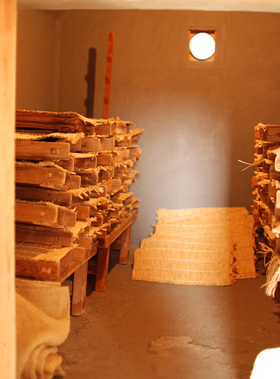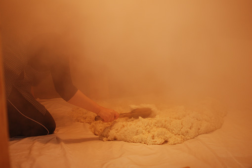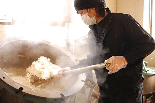麹は、昔ながらの煉瓦室上蓋製麹法という製法で作られます。100年以上経つというレンガで出来た室のなかは、硫黄の煙を使って殺菌したばかり。かすかに硫黄の香りが鼻孔をくすぐります。お米が蒸し上がってからは、淳子さんの出番。この室のなかでお米を手で広げていき、冷めて来たところで麹菌の種を播きます。さらに、12時間後に手で揉んで熱を均等にまわし、100年ものの板に盛り込んで2日間むろのなかで菌を育てるのです。室の中は大体30℃弱だそう。