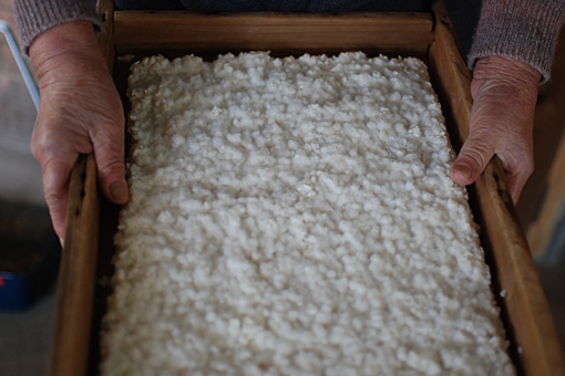 季節や気候によってかき混ぜたり室のなかに入れて置く時間を変えるそう。「一番気をつけないかんのは温度やな」。と俊夫さん。そう、手で揉み解していく時の温度が一番重要なよう。その年々の出来映えがあり、俊夫さんも、お父さんから「温度に1番気をつけろ」と言われてきたといいます。何時間むろに置いておくのか、そしてどの程度冷ますのかなどの加減は、やはり長年の経験と勘が必要となってくるところ。だからこそ、淳子さんは「うちは『じいちゃん時計』が必要なんです」と笑って言うのです。