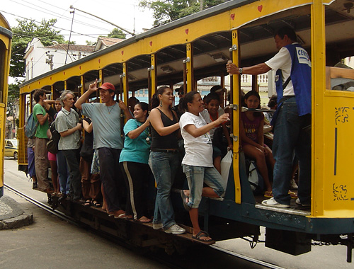 水道橋の上も走る路面電車、危なそうな乗り方だけど、皆さんニコニコ。
