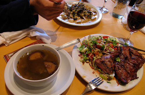 このステーキが抜群に美味しかった。左は椎茸のスープ。野菜もちゃんとした味がしました。