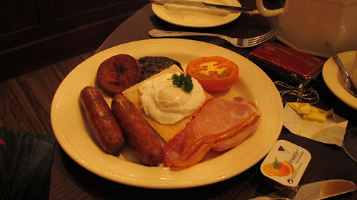 奥に血のソーセージブラック・プディングがちゃんとのっています。右のハムのようなものがアイルランドで良く出てくるとても美味しいベーコン。アイルランド国内、どこで食べても同じ味がするのが不思議です。