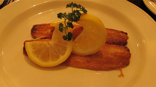 私は前回来た時に、見ただけで食べる機会がなかった、スモークしたニシンを軽く暖めてある料理を注文した。少し塩辛いが、塩鮭にように香りが良くとても美味しかった。