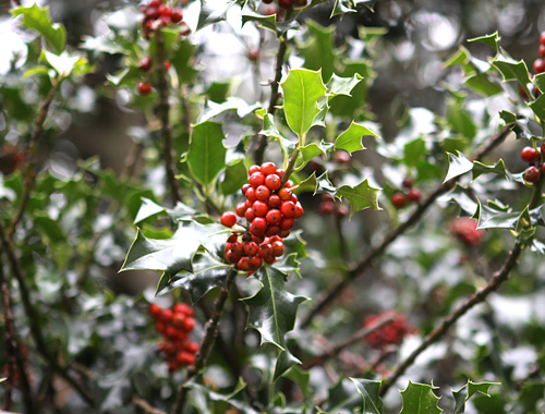 野生の柊のベリー。まだ真っ赤にはなっていない