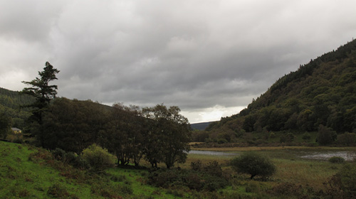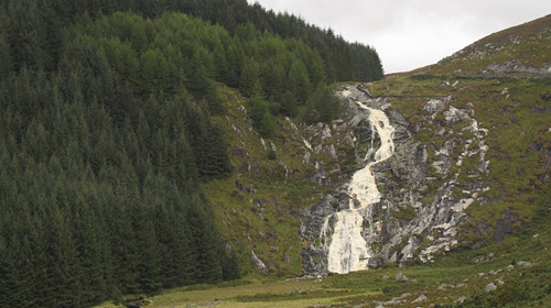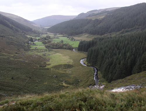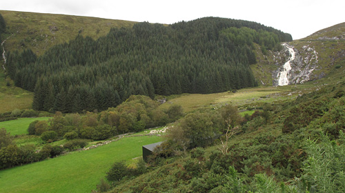 近くまで行って滝をよく見ると、川の水が岩盤の上を広がって流れ、落差は大きいですが遠くから見たほどの水量はありませんでした。滝から谷間を眺めると、ウィックロー渓谷らしい風景に牧草地と数件の家、放牧された羊たちが見えました。広大な自然それも泥炭地で水も少なく生活するには過酷な条件の谷間が丁寧に開墾され牧草地となっている風景に感銘を受け、思わず見とれてしまいました。強く優しい伝統音楽、先人、家族、友人を大切にする人情味ある気質はこの厳しい自然環境の中から生まれてきたのではないだろうかと強い風に吹かれながら思いました。