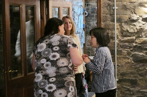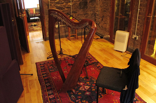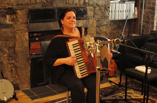 幼少の頃から伝統音楽に親しんで育った彼女の腕前は素晴らしく、フィドル演奏者のトーラ・カスティとのデュオで制作した「Three Sunsents」はIrish TimeのTop5に選ばれるほどで、アイリッシュ・ミュージック・マガジンの新人賞も受賞しています。そんなミレラが約束の時間よりも早くアコーディオンと共に待っていてくれました。私は初めてお会いしたのですが、アイリッシュらしい生真面目さとその笑顔のおかげで、とても気持ちの良いスタートになりました。写真は左がミレラ、真ん中がピアノのキャスリーン・ボイルです。キャスリーンもアイルランド、英国の両方の国において、ピアノとアコーディオンで全国首位タイトルを取得し、99年にROYAL SCOTTISH ACADEMY OF MUSIC AND DRAMA を伝統音楽専攻の最初の学生として卒業しています。今回レコーディングでは彼女のひいおじいさんが作曲した曲も収録しました。