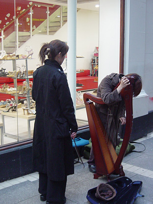 話はレコーディングから離れますが、アイルランドほど街に音楽が溢れているところは見たことがありません。それも伝統音楽で溢れています。ここに掲載したストリート・ミュージシャンはごく一部で街のあちらこちらで演奏しています。またアイリッシュ・パブに毎夜ミュージシャン達が集まり一晩中演奏しているパブも沢山あります。通常、その場に譜面はなく、リーダー格の人が弾き始めた曲を皆で演奏します。リーダー格のミュージシャンは3000曲ほど知っている場合が多いそうです。曲を知らない場合はもちろん演奏できません。まず、曲を体で覚え、演奏技術を学ばないとアイリッシュ・パブでは演奏できません。参加するだけでもたいへんな口伝の方法が今でもここアイルランドでは主流のようです。そこには、楽譜にできない抑揚と表現があり、それが伝統音楽の独特の発展を促し、土地の文化との結びつきをさらに高めていくのだと思います。伝統音楽は地域の仲間のための「音楽」であり、生活の中での自然な営みのようにも見えました。ストリート・ミュージシャンにとって街は修行の場であり伝承の場でもあるように思えました。