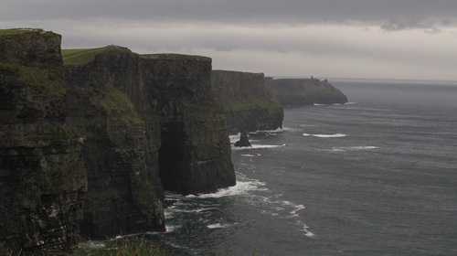 高さ120m~214m海面に対してほぼ直角に近い断崖です。ちょうどアイルランドらしい雲が広がり、渺々(びょうびょう)たる風景を見せていました。ケルト的風景には厳しい自然環境が隣り合わせにあるように思います。氷雨や細流、森や湖の内陸から荒波と絶壁、海岸風景まで、渺々(びょうびょう)、荒涼とした風景がなぜか浮かんできます。モハーの断崖も例外ではなく打ち寄せる波と風に煽られながら飛ぶ鳥をみていると空寂の感が湧いてくる思いがします。