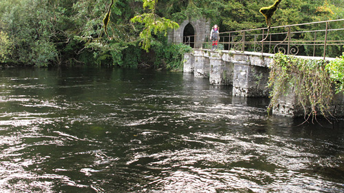 鬱蒼(うっそう)とした森が切れると一転して明るい大きな川に出ました。この橋を渡り始めると目的のモンクス・フィッシング・ハウスが見えてきます。