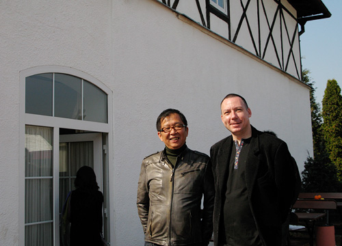 写真の後ろに見えているのがスタジオです。プラハ市内から車で30分ほど離れ、田園に囲まれた住宅街にある木造のスタジオでした。次回ブログで詳しくご紹介しますが、スタジオの演奏ブースからは外が見え、窓ガラスも二重にはなっていない普通の家とも思えるスタジオにとても興味が湧いた、第一日目でした。