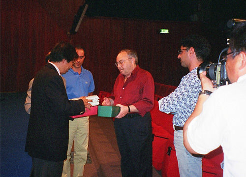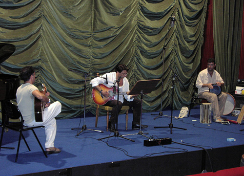 アリタリア航空でミラノ経由カターニア、そこからバスに乗り換えてタオルミーナに着きました。タオルミーナの街は19世紀から20世紀中頃までヨーロッパの上流階級の避寒地として発展しました。20世紀後半以降イタリア国内の夏のバカンスが恒例化すると、一般市民の避暑地として人気の場所になりました。近年では映画グラン・ブルーやゴッド・ファーザーの撮影地としても注目をあびて、世界中から多くの観光客が集まる場所になりました。そのタオルミーナで映画ロケ地と同じくらい人気を集めているのが、この人チコ・シモーネ氏です。我々がお邪魔したのが2002年9月。その時点で御年92才現役のミュージシャンでした。氏が毎夜出演していた五つ星ホテル、ホテル・サン・ドメニコは元ドメニコ派の修道院だった格式のあるホテルで、映画グラン・ブルーの舞台にもなった場所です。しかしホテルを訪れる観光客の大半のお目当ては、歴史や映画よりもチコの演奏だとホテルスタッフに聞きました。70年近くここタオルミーナのホテルでの演奏を中心として活動しているチコは地元でとても人気があり人々に尊敬されていました。一緒に街をあるくと、ほんの数百メートル歩くだけで様々な人々が彼に挨拶をしたり、プレゼントを渡します。チコも気さくに挨拶を交わしながら、プレゼントをもらう姿を垣間見てチコがどれほど皆に愛されているかがわかりました。