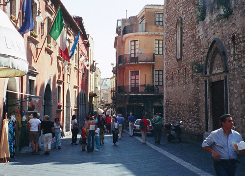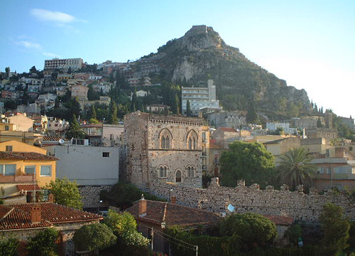 タオルミーナの街はタウロ山の中腹に位置します。海からの急斜面に作られた街の縦の道は登るのもたいへんな急な傾斜の細い道です。その海に続く道に交差するように等高線に沿って平らな道が作られています。少し横道にそれますが、このコルヴァイア宮はギリシャ、ローマ時代の建造物の一部を使い、アラブ時代に改修され、15世紀にシチリア王を選出する、シチリア議会が開かれた場所です。この急な場所に街が築かれたのには訳があります。シチリア最古のギリシャ人植民地ジャルデーニ・ナクソスがシラクーサに滅ぼされた後で生き残った者達が防御に適した街として建築したのが、このタオルミーナで紀元前4世紀からの歴史を持っています。地中海、イオニア海、テレニア海に囲まれた交通の要所としてのシチリアは苦難の歴史を持っています。