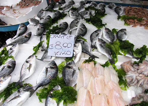 市場の朝は早い、翌日は撮影スタッフと早起きをしてナポリで一番大きい市場に直行です。見てください。日本レベルの生きのよい魚が並んでいます。今まで行った海外の市場でこれほどまでに生きがよい魚を目にしたことはありませんでした。それぞれが良い品質であることは一目瞭然でした。