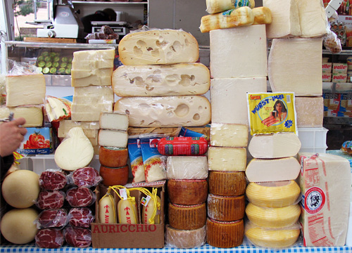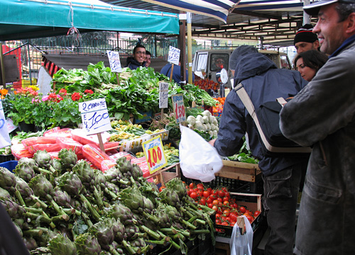 その元祖マルガリータを注文してみました。生地の厚さに驚きましたが、これがナポリのピザだそうです。日本で食べる厚い生地のピザとちがい、ほどよい柔らかさと粘り、噛むと何とも言えない芳醇な味がしました。ピザは生地を食べるものなのだと初めて知りました。もともとピザの起源はアラブのパンの一種ピタがナポリに伝わり、ピッツアと呼ばれるようになったようです。今回の録音は撮影が先の予定でしたので、さっそく恒例の市場巡りをする事になりました。
