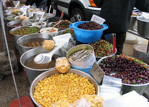オリーブや豆、鰯の塩漬けまで売っている、日本で言う漬け物でしょうか。見ていると少しずつ手にのせてくれて味見ができます。