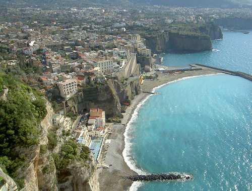 ちょうどナポリ湾を挟んで南対岸にコムーネ・ソレントがあります。日本で有名なイタリア民謡「帰れソレントヘ」の生まれた場所です。海沿いの断崖に寄り添うように走る狭い道を南に下るとすばらしく青い海が見えてきます。ここには六つ星のホテルがあります。六星など聞いたことがありませんが、最高という意味でイタリア的な表現のようです。歌手のマドンナなど有名人が常連のホテルだと地元の方から聞きました。この崖の真下の海岸にホテルはあり、駐車場脇にあるホテル専用のエレベーターで下に降りるようになっているようでした。見学をしたいと思ったのですが、どうやら予約を入れていないと見ることは出来ないようでした。さすが有名人御用達のホテルです。