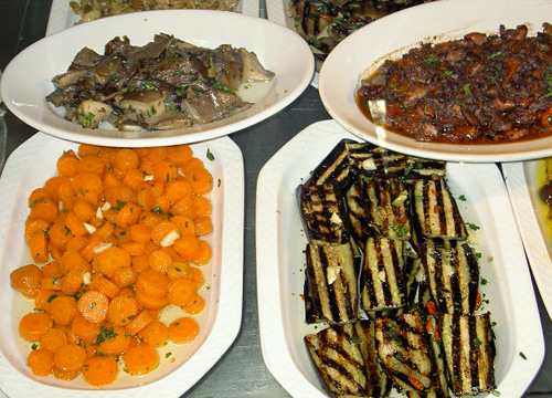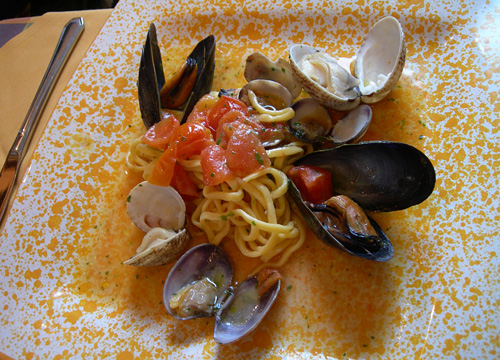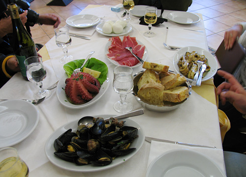 ナポリからソレントに向かって車で走ること20分、撮影の合間をぬって昼食によったレストランのテーブルです。なんとも剛胆な盛りつけですが、味は最高でした。生ハムもスペインのハモンセラーノのように少し堅めで良い香りがしていました。たこも蒸した物をそのまま、いつもはトマトと一緒にカプレーゼという名前で出てくるモッツアレラも切らずに皿に盛られて出てきました。なすを焼いてオリーブオイルにつけたものやムール貝、レストランとは思えないほどの気取りのなさなのですがどれもとても新鮮でした。