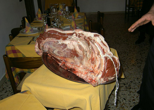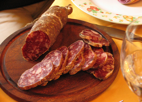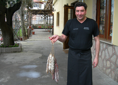 外から声がするので出て行ってみるとオーナーシェフが別の建物から腸詰めを持って来たところでした。野菜も腸詰めもすべてご自身で作っているそうです。イタリアの腸詰めは、さしずめ日本のカラスミや塩辛のような物なのだと納得しました。