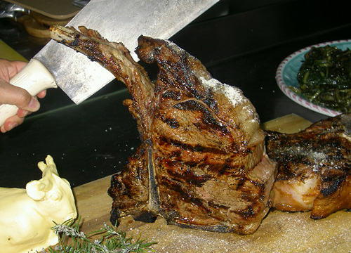 テーブルに座ったとたんに運ばれてきたのがこの大きな肉のブロックでした。いくらなんでもこれは大きすぎると思いましたら「どこを食べる」ということのようでした。経験がないことでしたので、スタッフ全員、目が丸くなっているだけでどうしたら良いかわからず、結局シェフにお任せすることになりました。