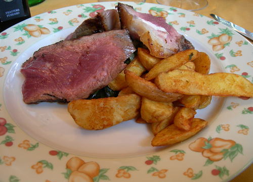 スタッフの一人が肉が食べたいと言い出しました。考えてみたらナポリに来てからピザやパスタ、魚介類ばかりを食べていることに気づき、それでは肉を食べに行こうということになりました。地元のコーディネータに連れて行かれたのがナポリとソレントの中間距離にある、畑の中のレストランでした。こんなところにレストランがあるのかなと思うような山の中にぽつんとありました。
