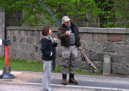 先ほども書きましたが、川の所有が厳しいスコットランドでは釣りをするのに会員権が必要な場合が多くあります。土地所有者は川を小さく区切り(1つの区切りをビットと言います)、ビットの左岸、右岸を週の内の1日、年53日という単位で権利を販売します。アトランティック・サーモンが良く釣れるビットは値段が高く、値段は過去実績で決まるようです。この方のように自分のビットに我々を入れてくれることはとてもまれで、ビット所有の釣り人がそのビットにいた場合、その釣り人から声をかけて来るまで、話しかけてはいけない習慣があるほど厳密な所有権になっています。この時はビットに入る前でしたので話しかけることが出ました。
