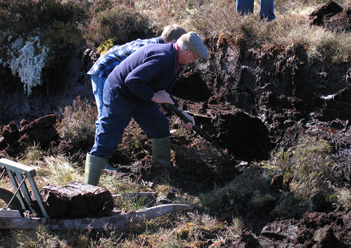 泥炭質の土地のヘザーの層はとても薄く、、剥がすとすぐにふわふわした泥炭層が出てきます。ヒースは土地全体がベッドのマットレスのような柔らかさでした。ピート層はかなり深く、歩くと体重のかかった長靴の周りから、じわじわと水が上がってくる湿地帯のようでした。そのためピートを運ぶ木製の一輪車は車輪が太く、軽く出来ていました。地面が安定していないので相当量のピートを運ぶ作業は熟練が必要で、大変な重労働に見えました。自分でも試してみようかと思いましたが、歩くのがやっとの私には無理だと思い諦めました。