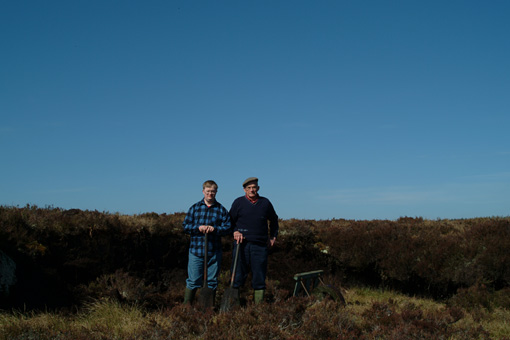 ヒースと呼ばれるスコットランドの荒れ地はヘザー(エリカ属の低木、別名ヒース)の群生地です。ハイランド地方は広大なヒース地帯ですので、おのずとピートの埋蔵量も多い場所です。我々が向かっているスペイ・サイドはその中に位置しています。そういう意味ではウイスキー作りに最適な場所でもあるのですね。家庭で暖をとる燃料として、うまいウイスキーの燃料にもなるピートはスコットランドの文化にとって大きな存在だと思います。今回は長年ピート掘りをされてきた地元の酪農家の協力を得て昔ながらのピートの手掘りを拝見させていただきました。木製の平らなスコップのようなもので、段差のある切り出し場所から、大きさを揃えながら丁寧にピートを切り出していきます。息子さんが手伝っていましたがやはりお父さんの熟練にはかなわないようでした。