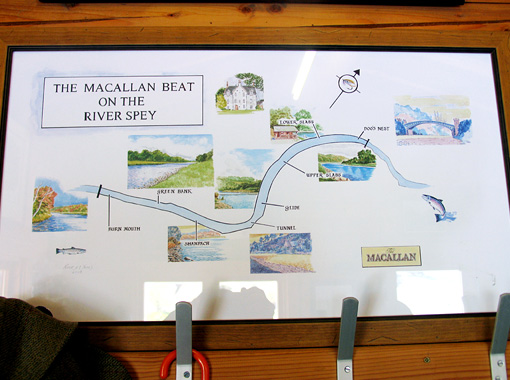 以前のブログでも書きましたが、スコットランドでは川の所有権はその川流域の土地に付属しています。上の写真はマッカラン蒸留所が所有している敷地内を流れているスペイ川の所有を表したイラストです。そのような理由から川の管理は地主が行います。ビット(BEAT)と呼ばれる区間に分けて1日単位ごとに年間契約で有料貸し出していました。このエリアで年間釣れるアトランティック・サーモンの数は80~100本程度だそうです。数が釣れるビットですので、借りるのにも競争が激しいようです。