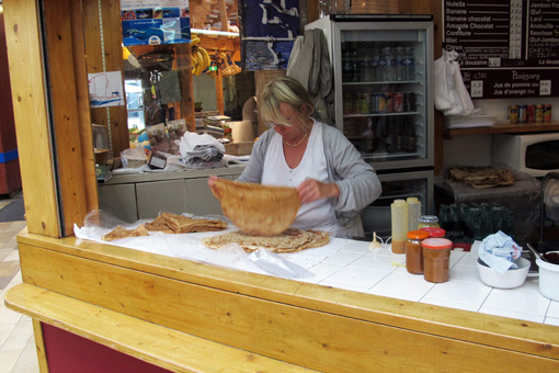 市場で美味しそうな食材を眺めていたらとてもお腹が空いてきました。ちょうどお昼の時間だったのでさっそくカンペールの食を味わうことにしました。今回は運良く、ミュージシャンであるフルート奏者のトーマスさんが案内を引き受けてくださっていましたので、カンペールで一番うまいガレットの店に行こうということになりました。