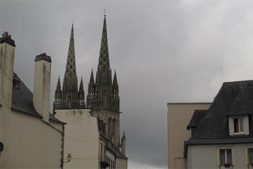 朝食をとってから全員でカンペールの散策に出かけてみることにしました。ホテルを出て少し歩くとサン・コランタン大聖堂が見えてきます。周辺が旧市街地になっていて古い時代のイメージがつかみやすいようでした。この大聖堂はブルターニュ地方で初めて建てられたゴシック様式の美しい聖堂で、街のどこからも見えました。聖堂の中央ハザード上部には先回のブログで紹介しました、海に沈んだ伝説都市イスを築いたグランドロン王の騎馬像があります。カンペールはグランドロン王が築いた街で、聖人コランタンに差し出した城の敷地にこの大聖堂が建てられているとの言い伝えがあるようです。美しい街の景観とホテルの名前、地元の人が愛している神話の場所に立っているという実感で得もいえぬ感慨が起こりました。