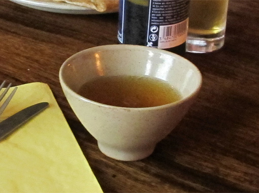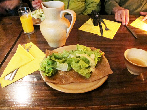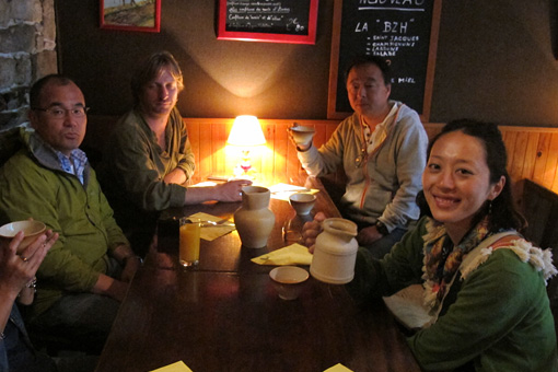 それではということで、シードルを頼むと写真のポットに入って出てきます。かなり沢山入っていました。皆が持っている湯飲みのようなシードル・ボールで飲みます。豊潤なリンゴの香りして、少し甘くとても飲みやすい飲み物でした。ほぼ常温に近くお腹にも優しそうでした。お店によって味が違うみたいですので人気のクレープリーになるためにはシードルの味がとても大切な要素であることがわかりました。