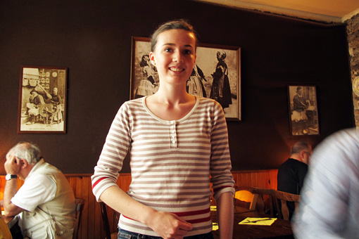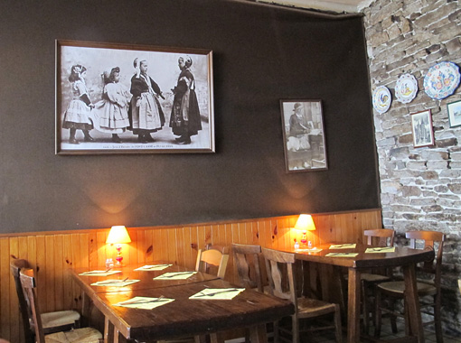 二度目にお邪魔した時、我々が最初のお客でしたので店内を撮影させて頂きました。年代物の木のテーブルとイス、壁にはカンペール特産の陶器と民族衣装を着た古い写真が飾ってあります。気取らない温かな雰囲気がとても素敵でした。こういったクレープリーで、気のあった仲間が、ガレットをつまみながらシードルを飲み、会話を楽しむのがブルターニュ地方のスタイルのようです。