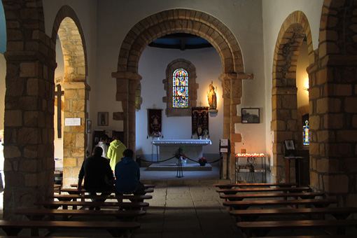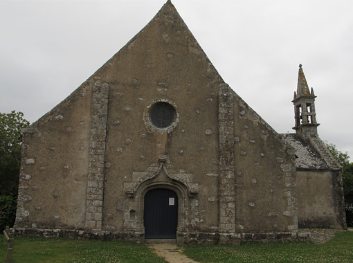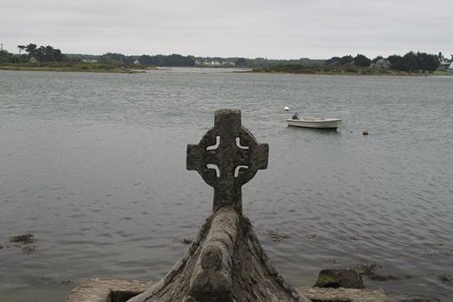 カンペールから東南、塩湖で有名なゲランドに向かって車を走らせ、80kmほど行ったところにエテル川があります。その河口の口ヴォシュランと呼ばれる大きな湖状の吃水域があり、そこに浮かぶ小島が聖カド島です。この聖カド島の教会には海に面してケルティック・クロスを冠した祠があると聞き訪れてみる事にしました。駐車場に車を停め、石造りの橋を徒歩で島に渡ると小さなカド教会が建っていました。