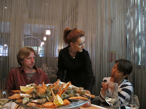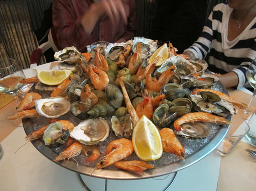 トーマスさんへのお礼でしたが注文はすべてお任せすることにしました。もっともフランス語以外があまり伝わらないのでお願いしたほうが無難です。その結果最初に出てきた品はカンペールの魚介類オードブル盛り合わせです。日本の新鮮な魚介類を食べている日本人にとって、海外での海鮮料理はオーダーしていつも後悔するメニューです。今回トーマスさんお奨のこの一品はとても新鮮で日本ではなかなか味わえないカンペールらしいおいしさでした。塩味とレモンでいただきました。市場で魚介類を見た時に我々が食べたそうな顔をしていたのをトーマスさんが気遣ってくれたようにも思いました。