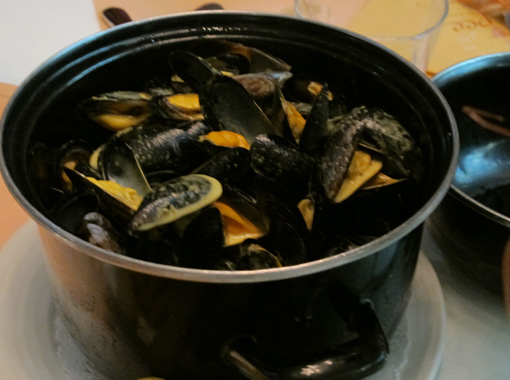 これもヨーロッパでは良く出てくるムール貝のワイン蒸しです。おきまりのバケツのような容器で出てきました。このムール貝も絶品でした。