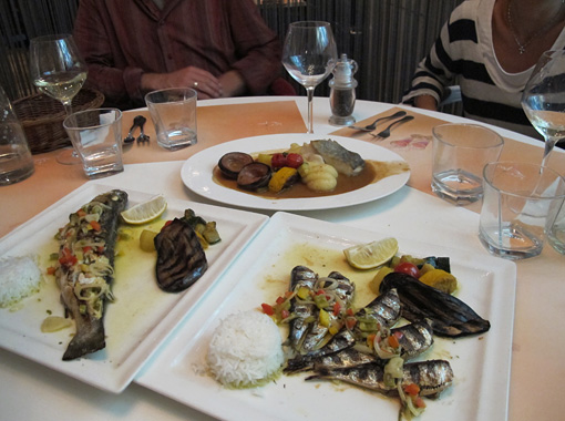 私は手前の鰯のグリルを頼んだのですが量を見てびっくり、真鰯だろうと思うのですが新鮮なものを塩焼きにして、ご飯が添えてあります。右はグリルした茄子です。お茶碗と和皿に盛ったらそのまま日本食だと思いました。海の料理は洋の東西を問わず、同じような食べ方をするものだと妙に親近感が湧いてくる美味しい一品でした。