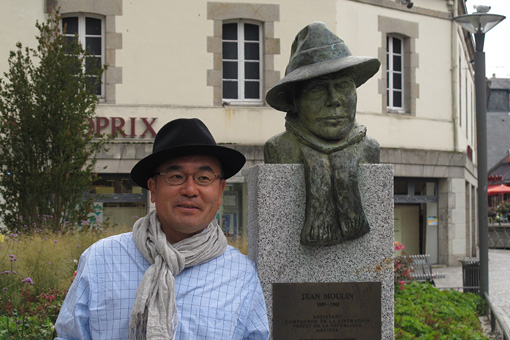 途中帽子屋により帽子を購入したクリエイティブ・ディレクターの新村さんと歩いていると、街角に銅像があることに気がつきました。近寄って見ると第二次世界大戦初期のフランス・レジスタンス活動の英雄ジャン・ムーランの銅像でした。フランス全国抵抗評議会を創設した歴史に残る英雄です。マックス・ジャコブとの親交も厚く、自分でも絵を描く美術愛好家としても有名です。買った帽子と同じ形の帽子をかぶっている時に、偶然にも同じ美術を愛する英雄と出会えた新村さんが記念撮影をしました。ADCの会員でもあり、MUJI BGM CDのジャケットを当初から手がけ、様々な方面で活躍する商業デザイナー新村さんのひょうきんな一面です。