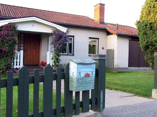 可愛いポストを発見しました。緑の木製の柵と緑の芝生、白い手摺りに茶の木製のドア、綺麗に品良く植栽されているエントランス。そのまま絵に描いたような「北欧」の印象です。