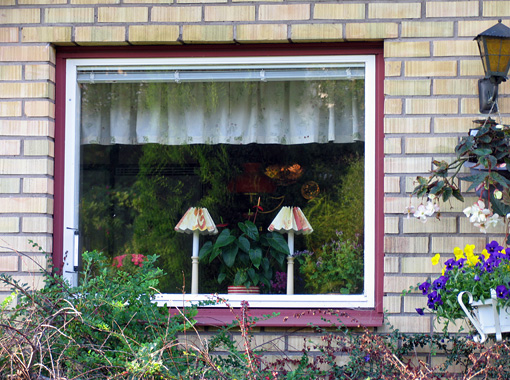 こちらの窓は窓枠の白に対して、色を使わないで形で見せていました。他の家々の窓も一応に気を使っていて、あまりにも美しい窓が並んでいるので驚きながら歩いて行くと庭も素敵なことに気がつきました。