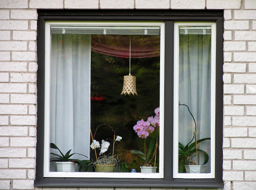 窓がとても美しく演出され、外を通る人が楽しめるようにと工夫している気がしました。窓枠とランプシェードの配色がとても素敵です。