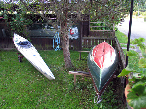 シーカヤックとカナディアン・スタイルのカヌーが置いてある庭を見つけました。理由が難しいのですが、とてもおしゃれな感じがとてもしました。