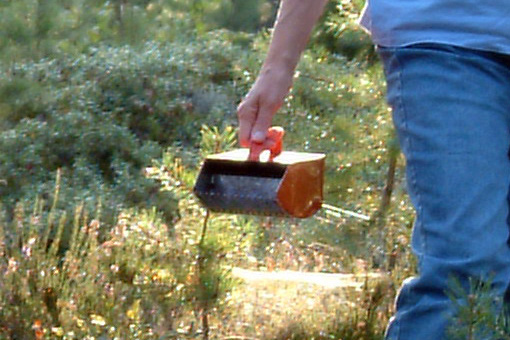 彼女は箱のような形状で一方に口が開き、その下部には櫛の歯のように金属の棒を並べて付けてある、金属製のチリトリ型の道具を取り出しました。その道具で豊富に生えているベリーをその櫛の歯の部分を使いじょうずに剥いていきます。そうすると瞬く間に箱の部分一杯にベリーが集まります。このとても効率が良い道具を貸していただき、皆でベリー狩りが始まりました。
